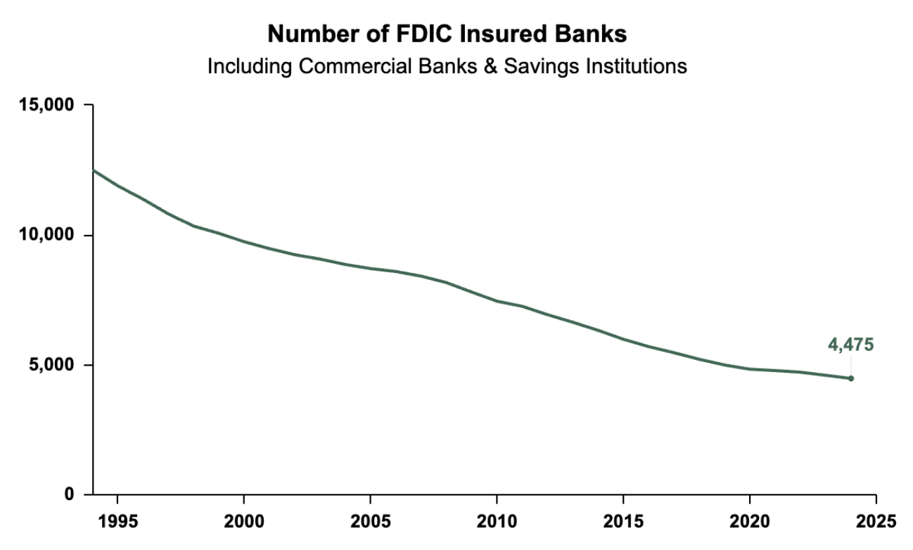 Finally, the landscape is characterized by intense competition driven by consolidation. The number of FDIC insured banks has fallen by more than half since the mid-90s (Exhibit 1), concentrating deposit market share in the top 10 largest institutions, which have grown from holding 12% to 48% of the market (Exhibit 2). AI could either be used by these incumbents to leverage their immense scale and squeeze out smaller players, or by agile challengers who can redefine value in a highly contested market